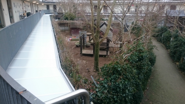 Het bestaande glasdek lekte behoorlijk dus werd er besloten om het dek compleet te vernieuwen. We hebben een nieuw polycarbonaat dek gemonteerd voorzien van doorlopende nokluchting. De luchting heeft gelijktijdig een nieuw mechaniek gekregen.