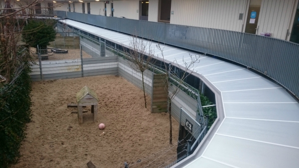 Bij Dierenopvang Amsterdam hebben we de looppaden voor de hondenhokken mogen voorzien van een overkapping. De overkapping is uitgevoerd met zonwerende polycarbonaat platen. Dit zorgt ervoor dat de honden beschut tegen regen en zon zitten.